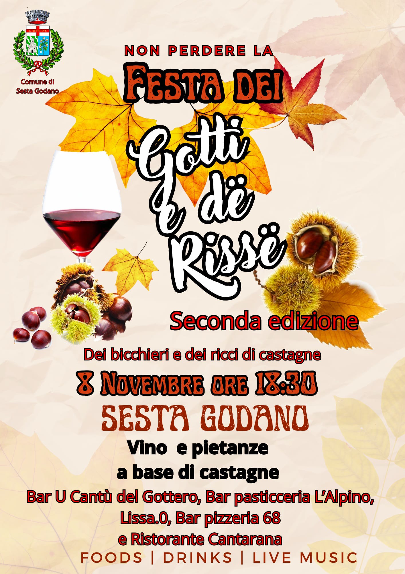 2° EDIZIONE- SABATO 8 NOVEMBRE DALLE ORE 18:30 VINO E PIETANZE A BASE DI CASTAGNE